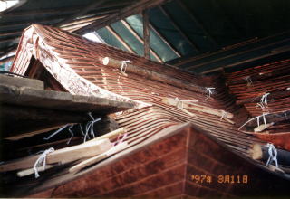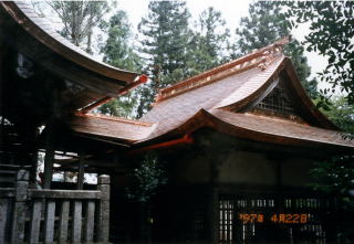 以前は檜皮葺の軒付けを残し屋根平地は鉄板葺の覆い屋根でありました。
